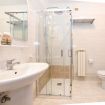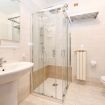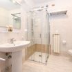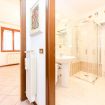L'ampio bagno piastrellato è dotato di doccia, lavabo, WC, lavatrice e bidet.
