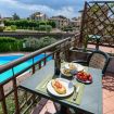 All'esterno si trovano un tavolo e delle sedie per mangiare all'aperto, con vista sulla piscina sottostante. All'interno, l'area salotto dispone di un comodo divano e di una TV, oltre che di un tavolo da pranzo con sedie. La cucina è ben attrezzata con piano cottura, forno, microonde, frigorifero/congelatore e macchina per il caffè (modello Lavazza "Dolce Gusto".)