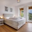 Durch einen Bogen gelangt man vom Wohnraum in den Flur, der mit einem geräumigen Schrank ausgestattet ist und dann weiterführt ins helle freundliche Schlafzimmer mit Panoramablick auf den See. Im Schlafzimmer befinden sich ein bequemes Boxspringbett, ein offenes Schranksystem und ein Sessel mit kleinem Tisch. Der an das Schlafzimmer anschließende überdachte Balkon lädt mit bequemen Outdoor-Sesseln und einem Tisch zum Verweilen und Entspannen ein.