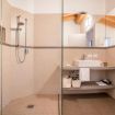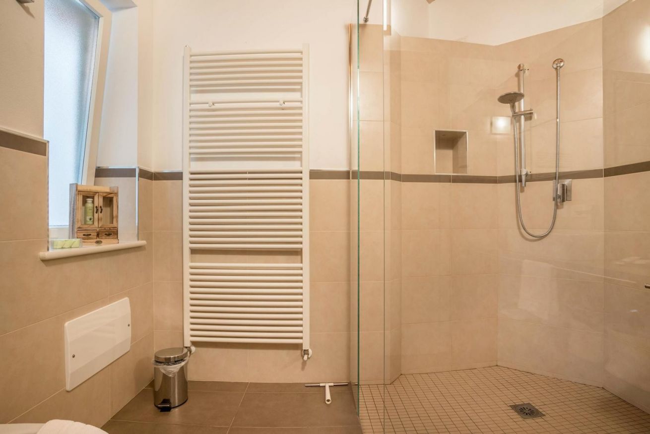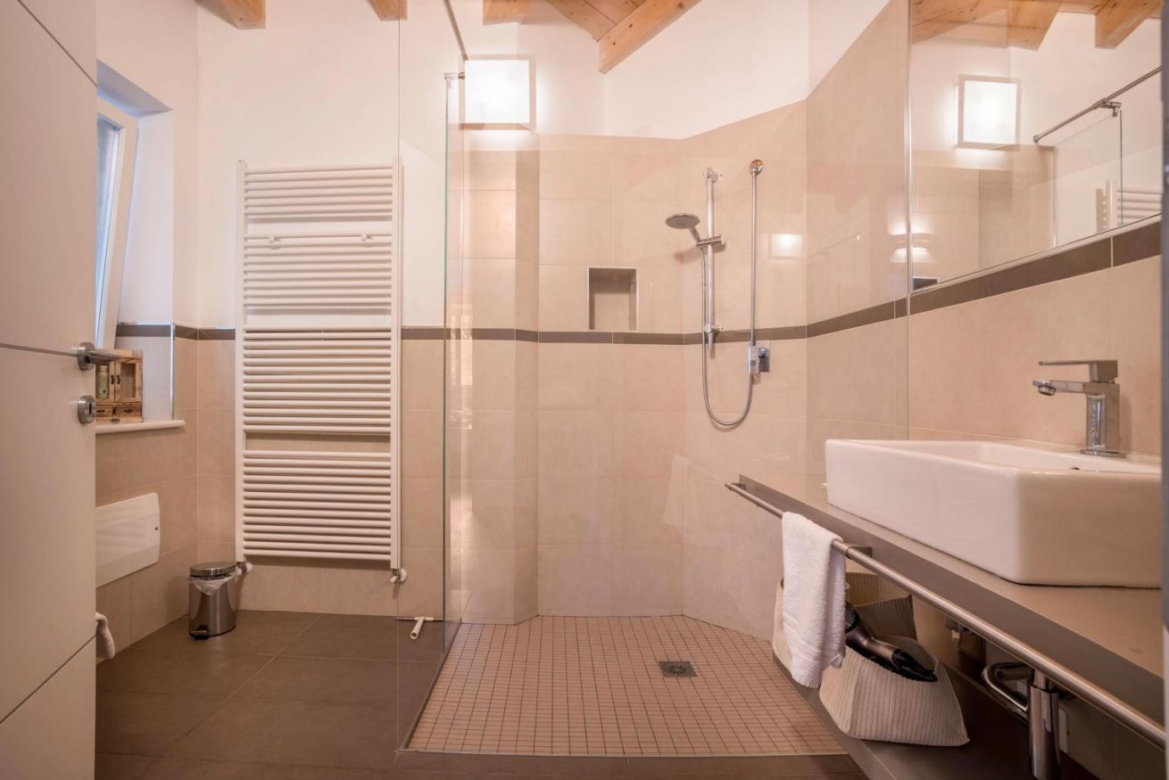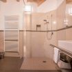 Das großzügige und stilvoll eingerichtete Badezimmer verfügt über eine bodentiefe Dusche, WC sowie ein Bidet.